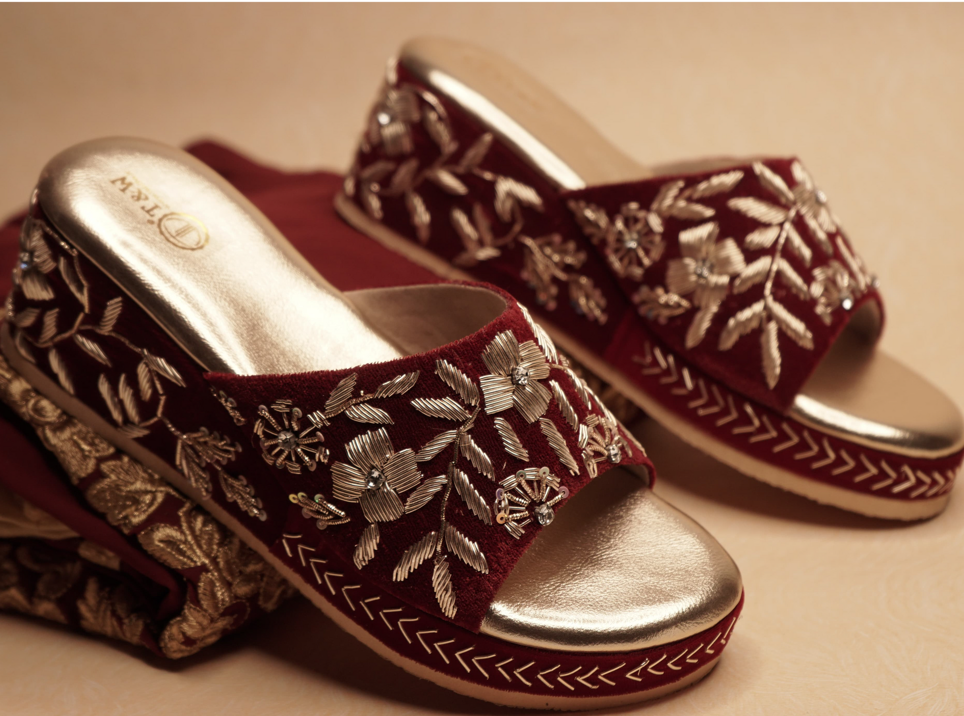 "Elegant Indian designer footwear with cork heels, ergonomic doctor soles, non-slip outsoles, and exquisite dabka embroidery."