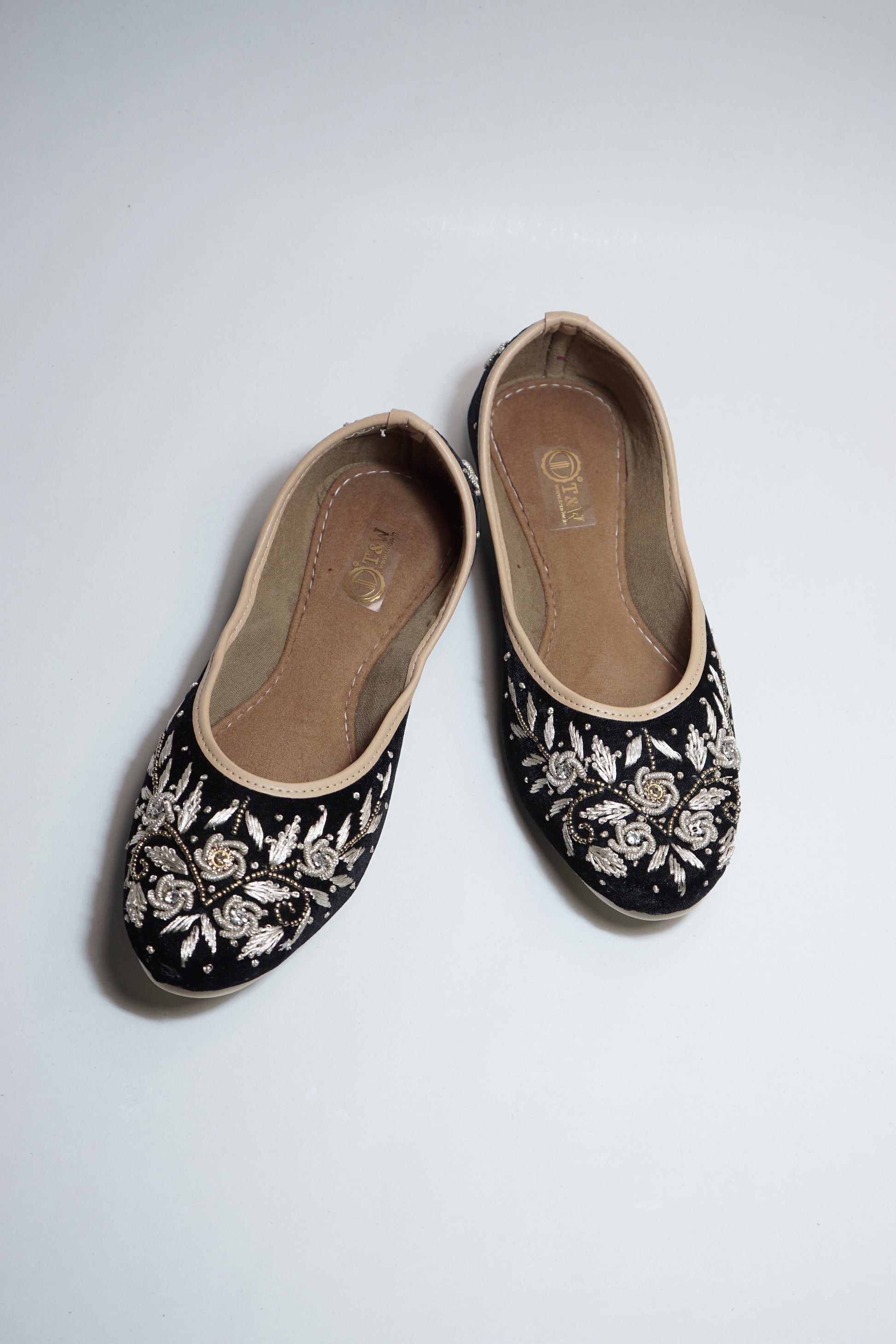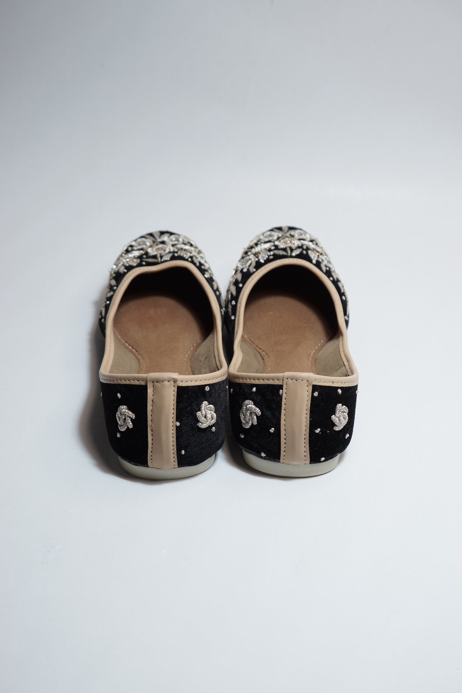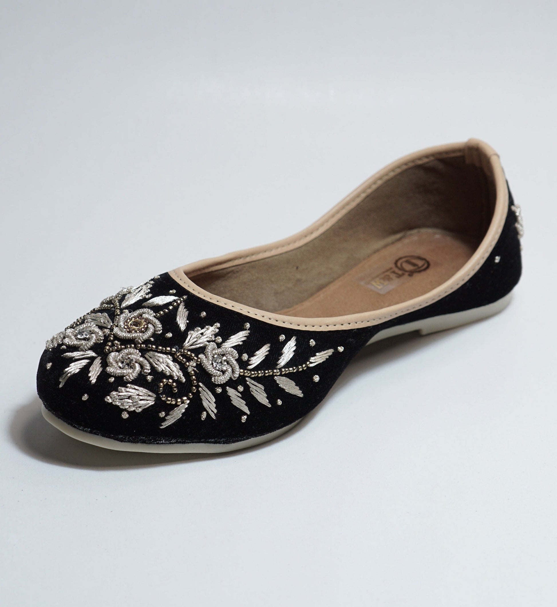 Introducing the Banu Spring Jutii, crafted with expert precision. Its black spring dabka belly features exquisite velvet work, showcasing traditional Indian tandw techniques. Elevate your style with this elegant and unique footwear.