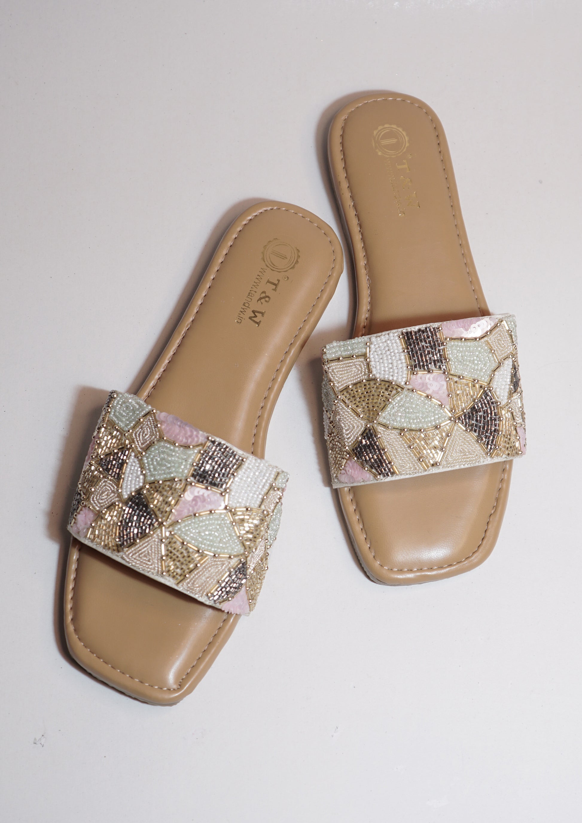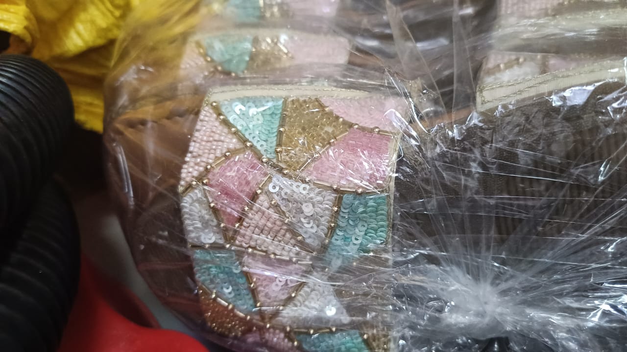 Damini Dabka Work flip-flops are designed for comfort and style. The intricately crafted Dabka work adds a touch of elegance to the PVC sole and doctored inner sole. Available in 5 variations including inverse color, pista, gray, Zig Zag Diamond, and light blue and pink. Elevate your footwear game with Damini Dabka Work.