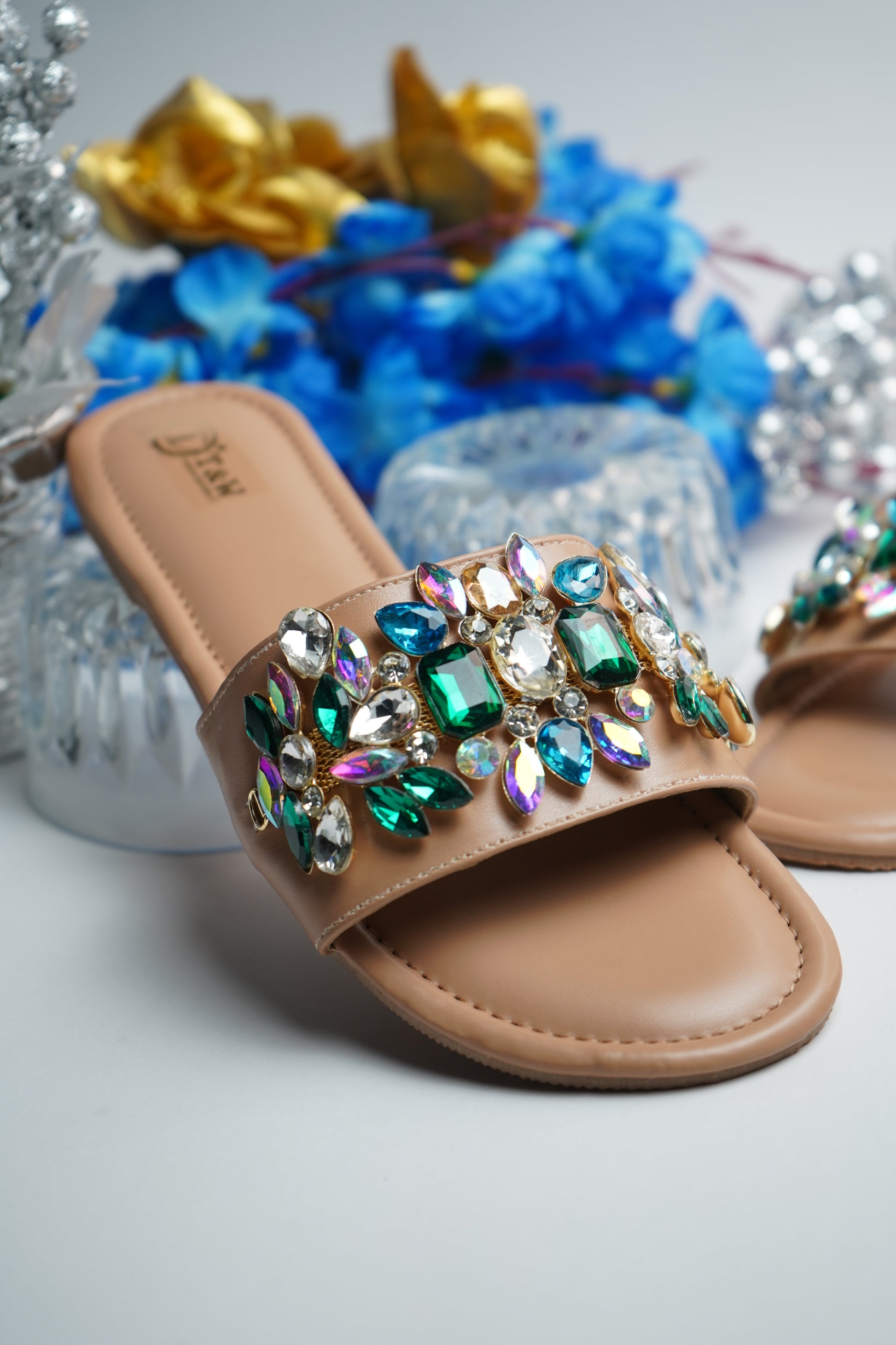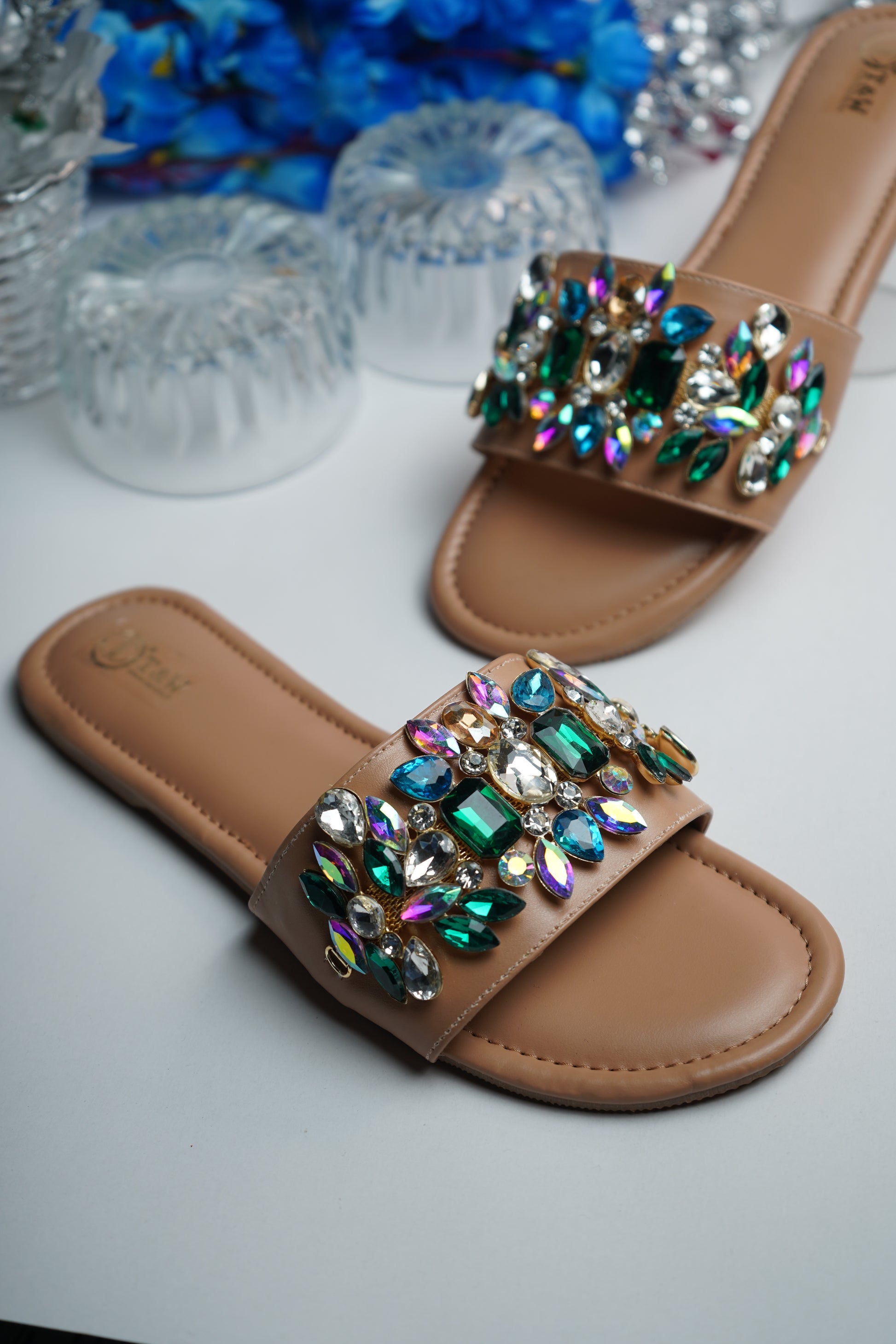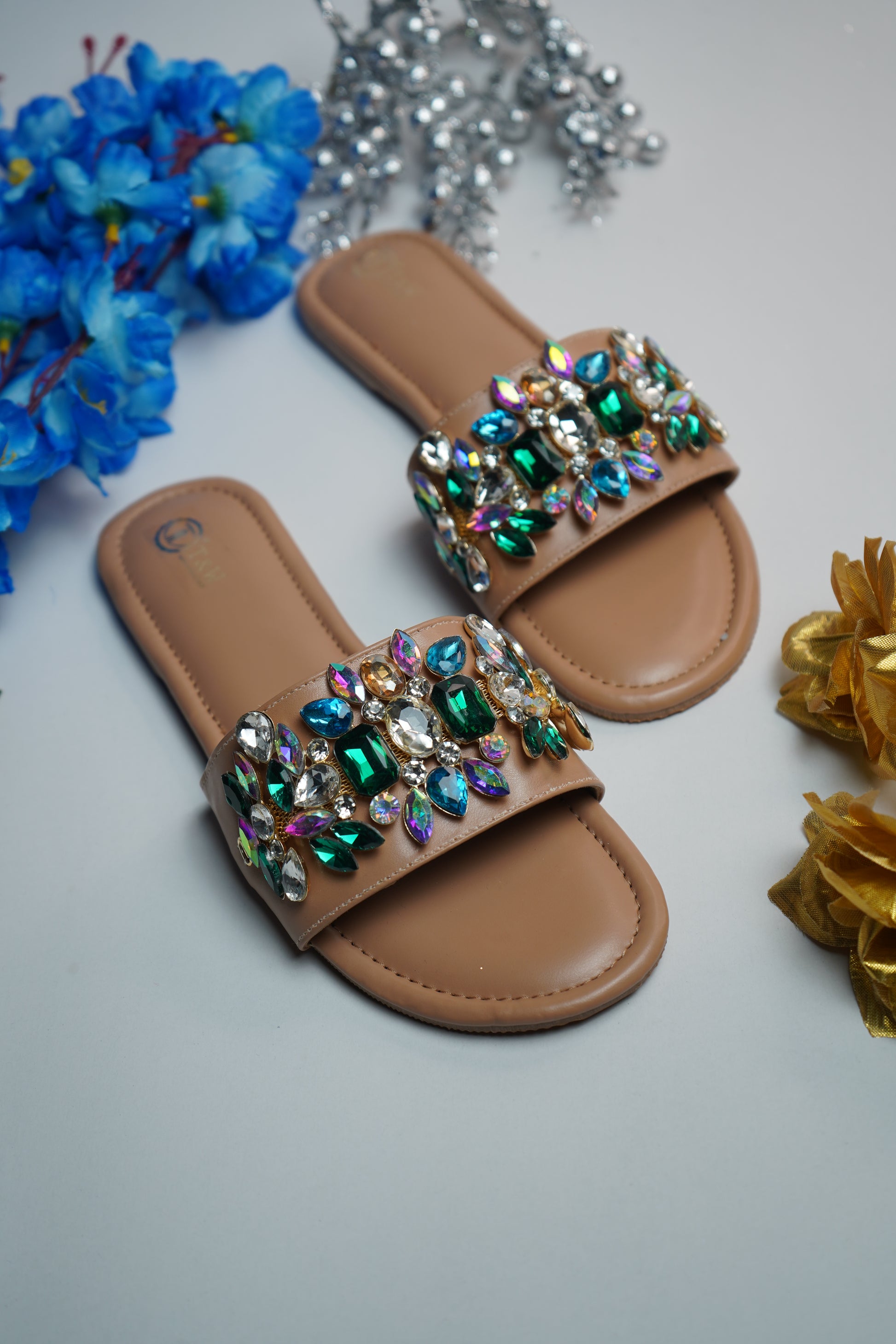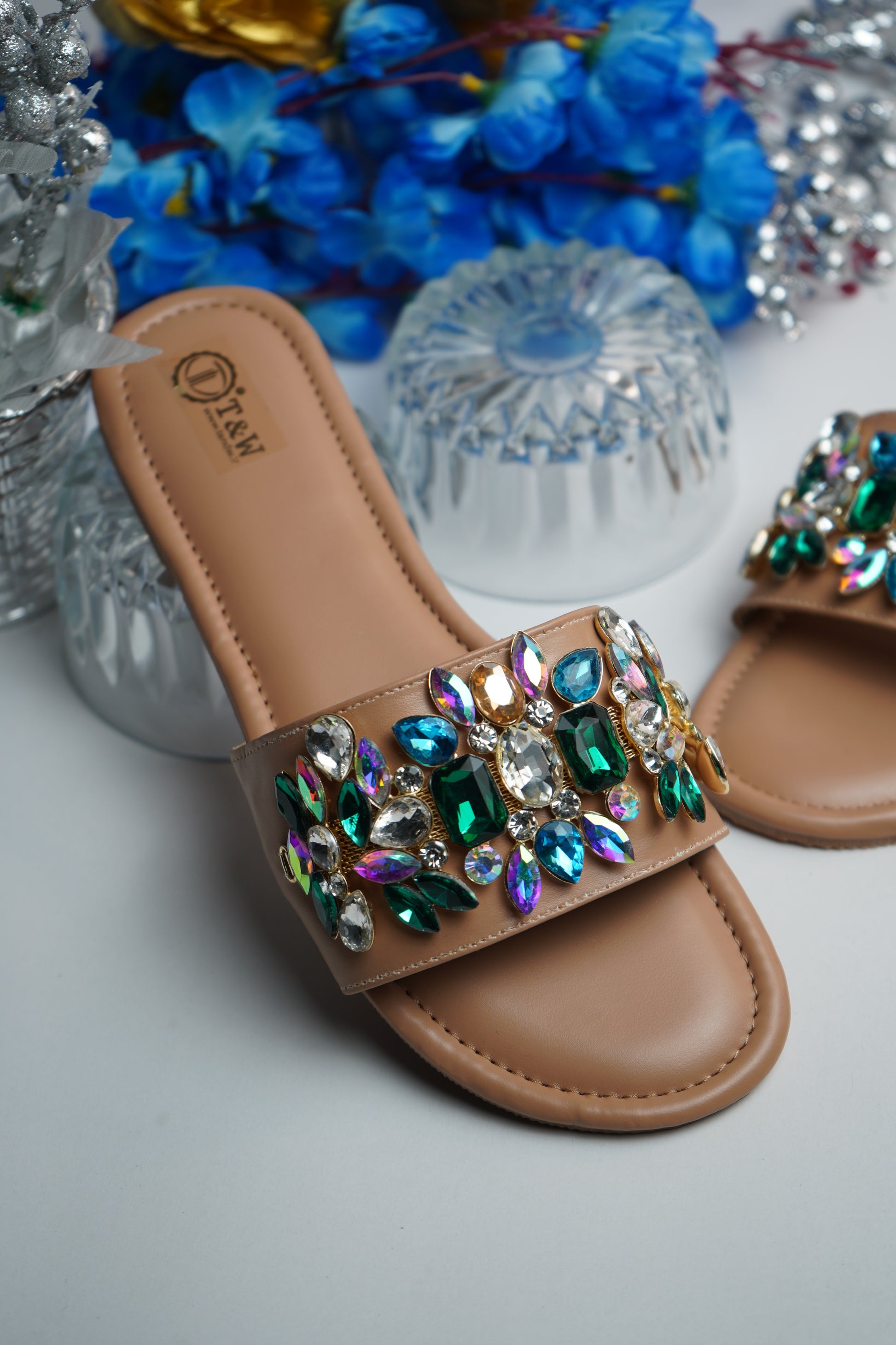 Experience comfort and style with Jaagruti (Crystal Flate). Our Crystal Step Up technology provides cushion and support for your feet, while the Inner Doctor Sole promotes superior foot health. The Non-Sleep Sole ensures a slip-free walk, and delicate stone work adds a touch of elegance. Made in India with Tandw materials.