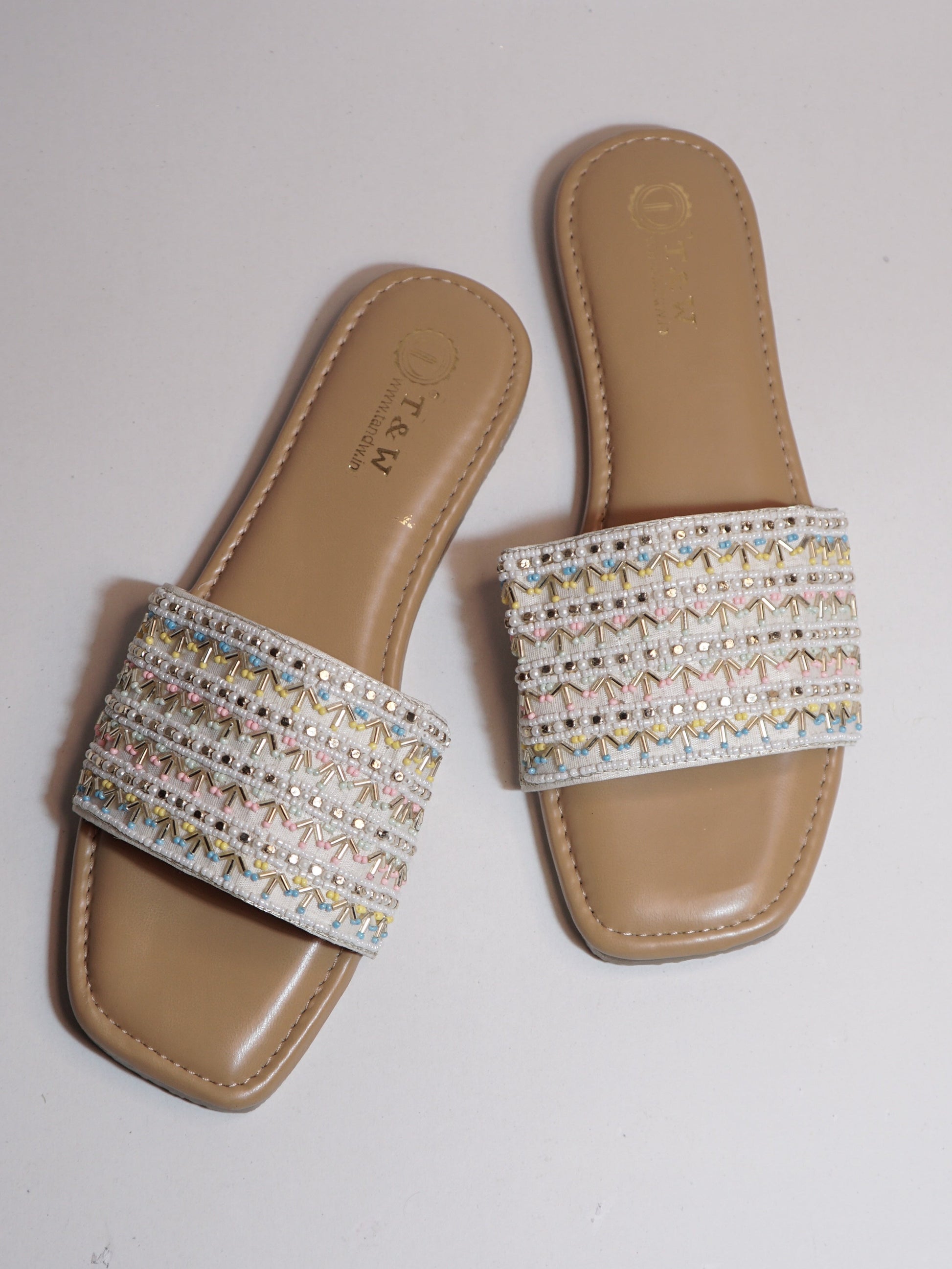 Introducing the Janaki Flate Flip Flop - the perfect blend of comfort and style. This flat flip flop features an Inner Pushan Sole for ultimate support and stability. With its elegant Party Wear design and exquisite Dabka Work, it's the perfect addition to any outfit. Made in India with quality in mind.