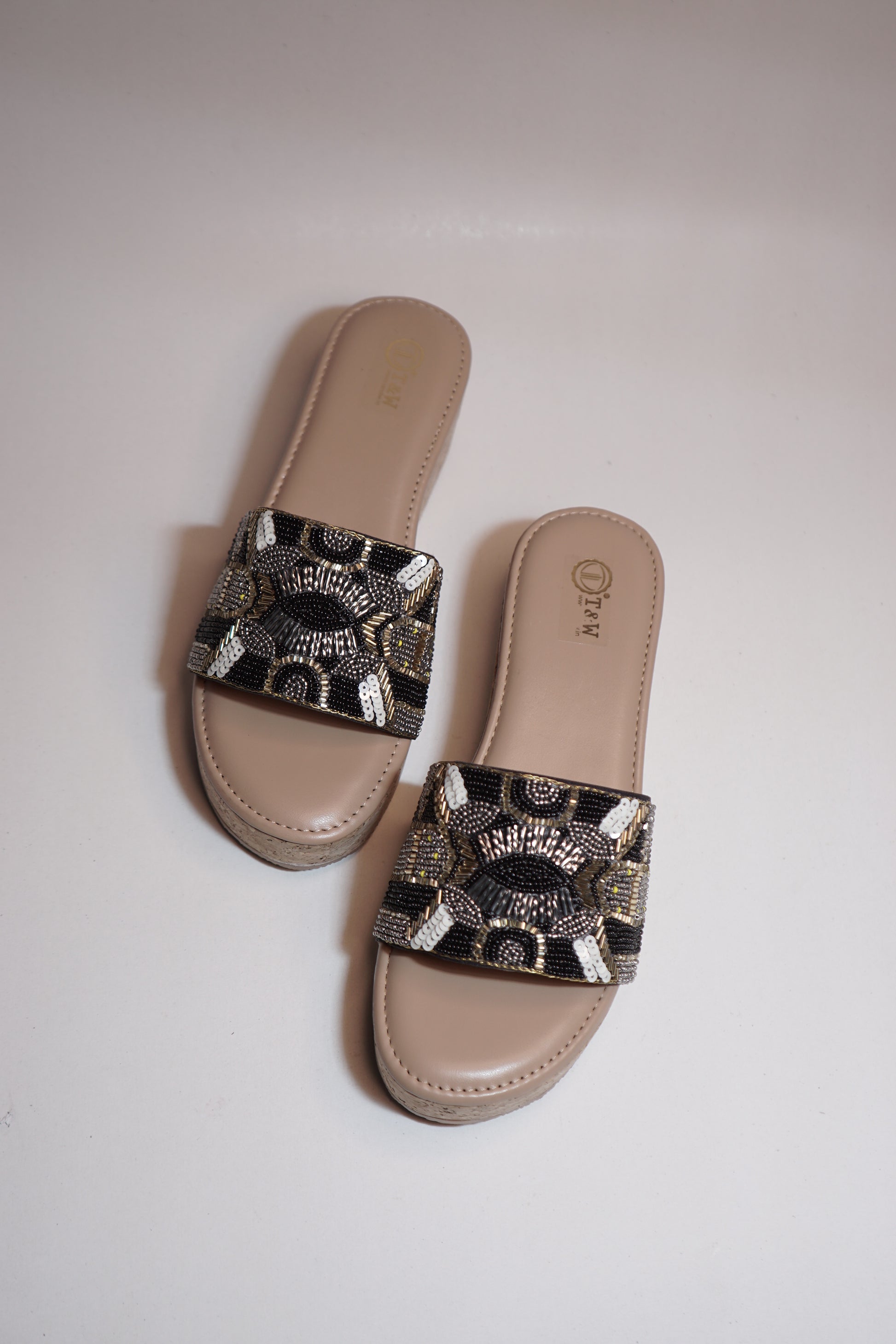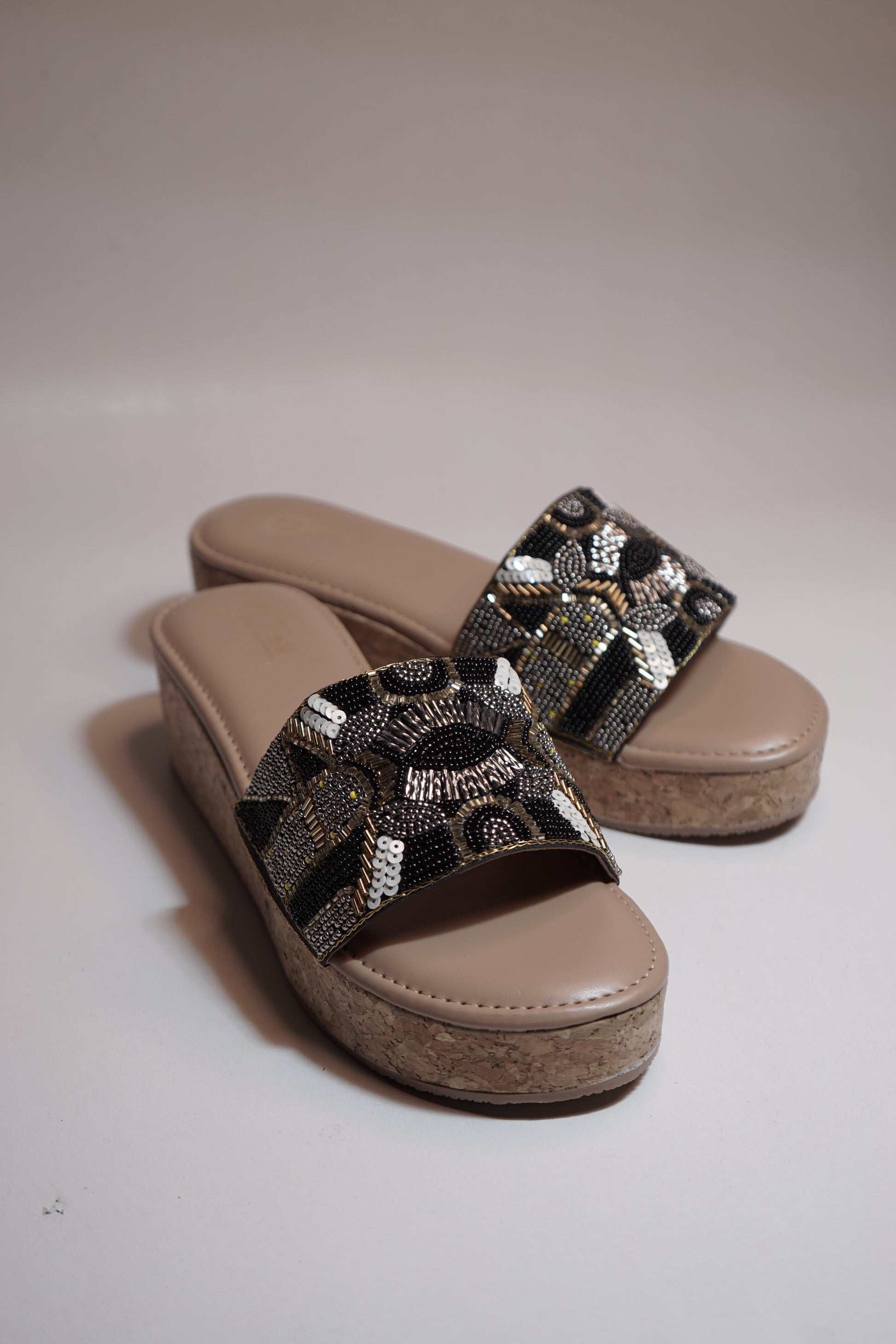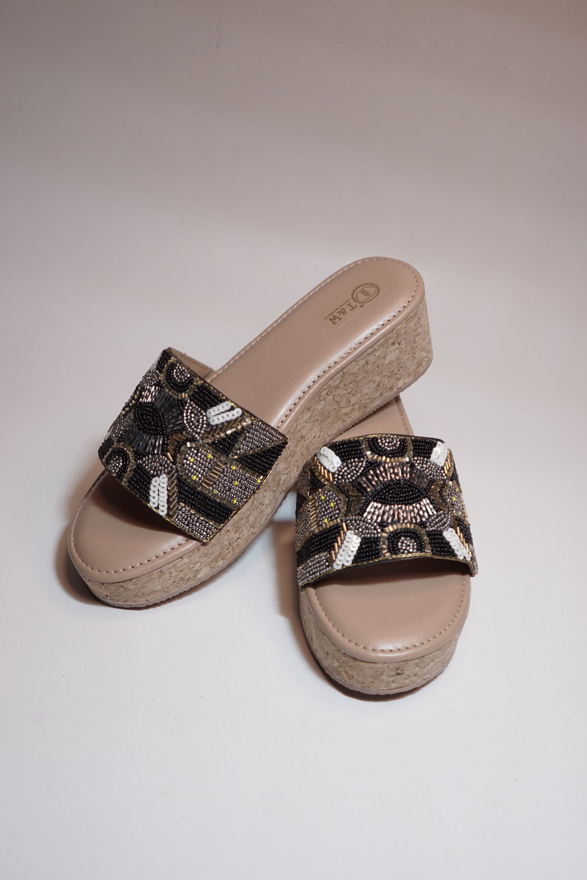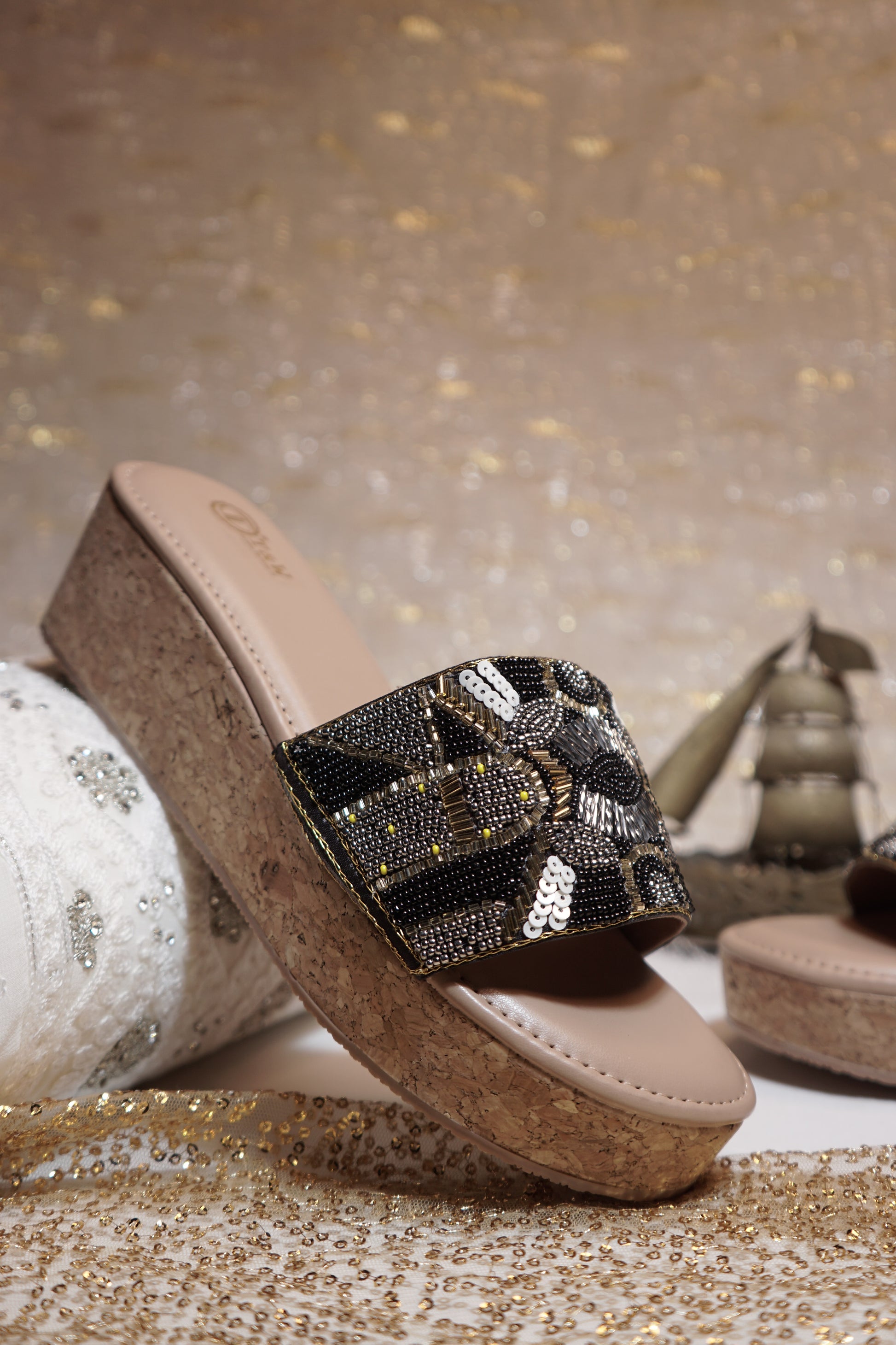 Introducing the Kalpana Cork Heels - the perfect combination of style and comfort. The Kalpana Cork Heel provides excellent support and the Inner Doctor Sole ensures all-day comfort. With its Sport Shoe Pasting and Black Dabka Work, these heels are versatile and stylish. Handcrafted in India with Tandw, these heels are a must-have for any fashion-forward individual.