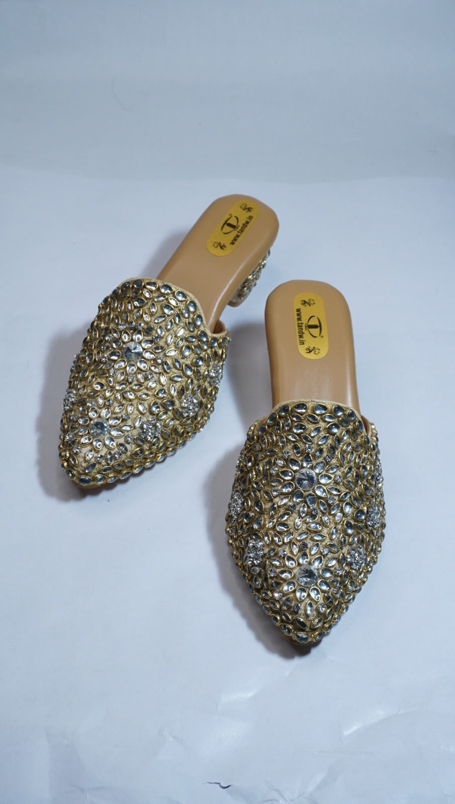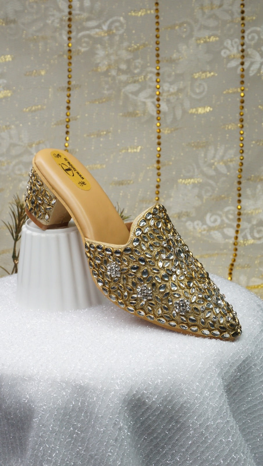 Elevate your style with our Madhuri Heel Mule. Featuring a non-slip sole to keep you steady on your feet and an inner Pushan sole for added comfort, these mules are perfect for all-day wear. The intricate crystal work and traditional designs add a touch of India to your ensemble.
