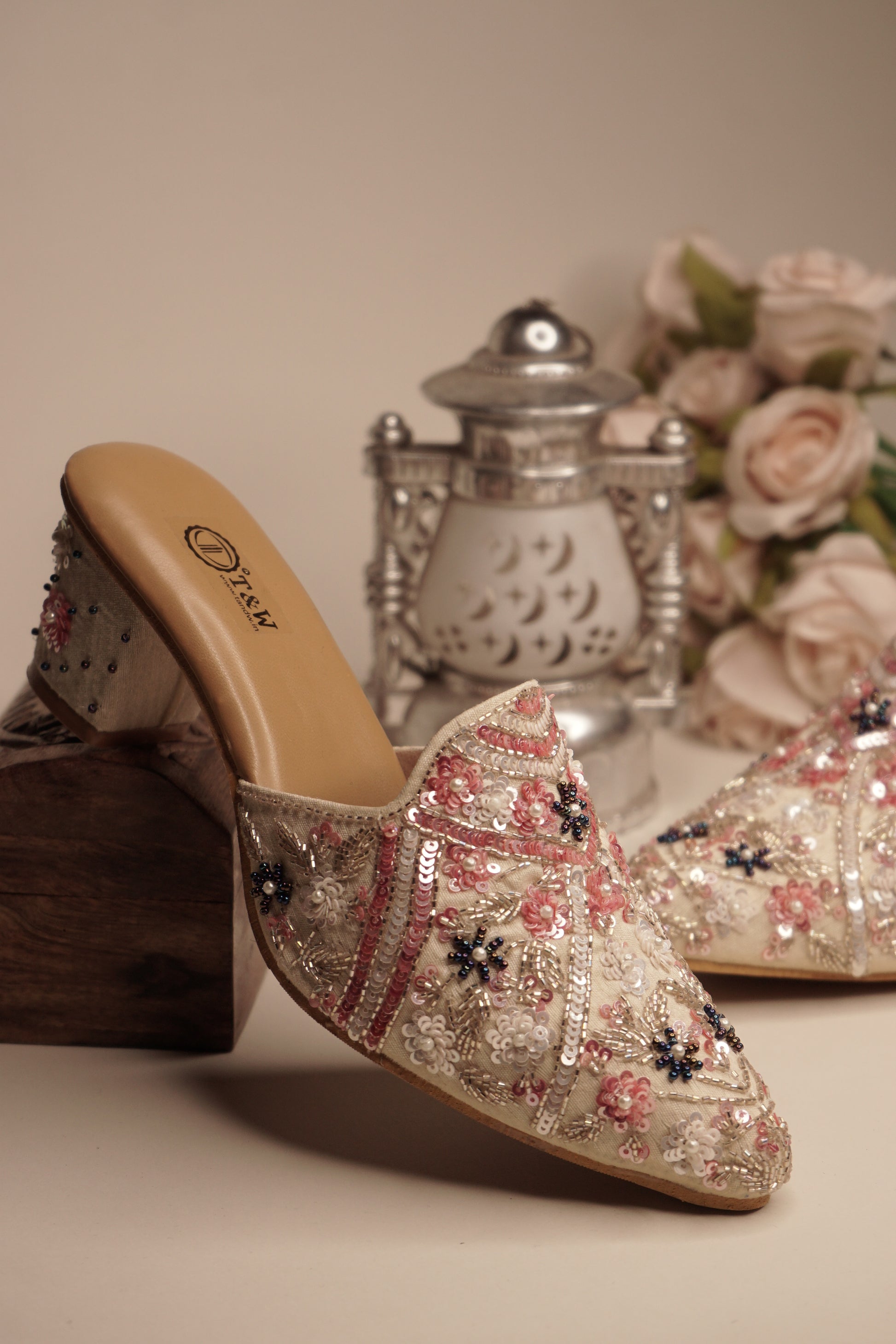 Rebecca is a sleek Heel Mule designed with Inner Doctor Sole for optimal comfort and Non-Sleep Sole for safe steps. Embellished with elegant Dabka Work and expertly pasted with Sports Shoes Pasting technique, these handmade shoes are crafted in India with precision and quality materials.