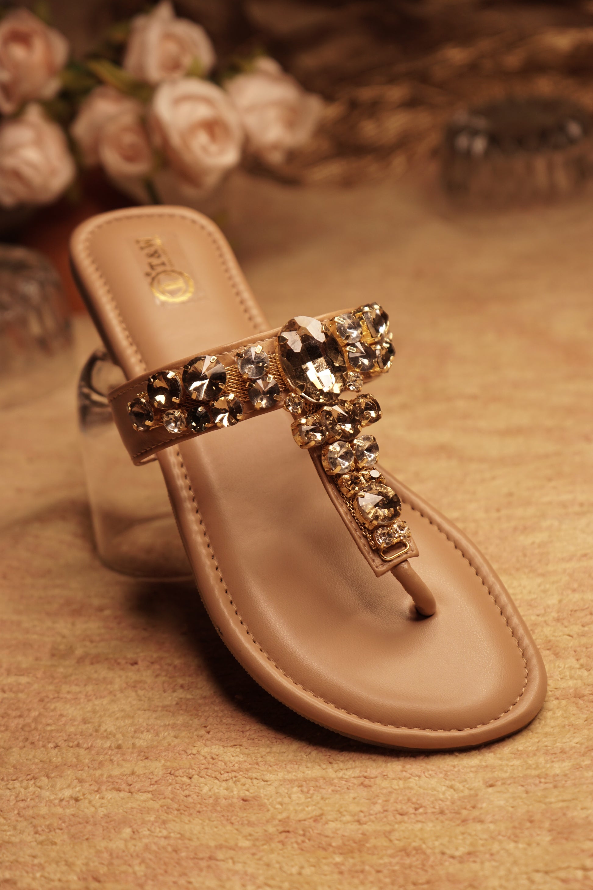 Discover the perfect combination of style and comfort with Shamba's Crystal V shape sandals. The Inner Doctor Sole provides superior support and the soft sole ensures all-day comfort. Designed with stunning crystal work, these sandals are perfect for parties or everyday wear in India. Experience the luxury of Tandw craftsmanship with Shamba.