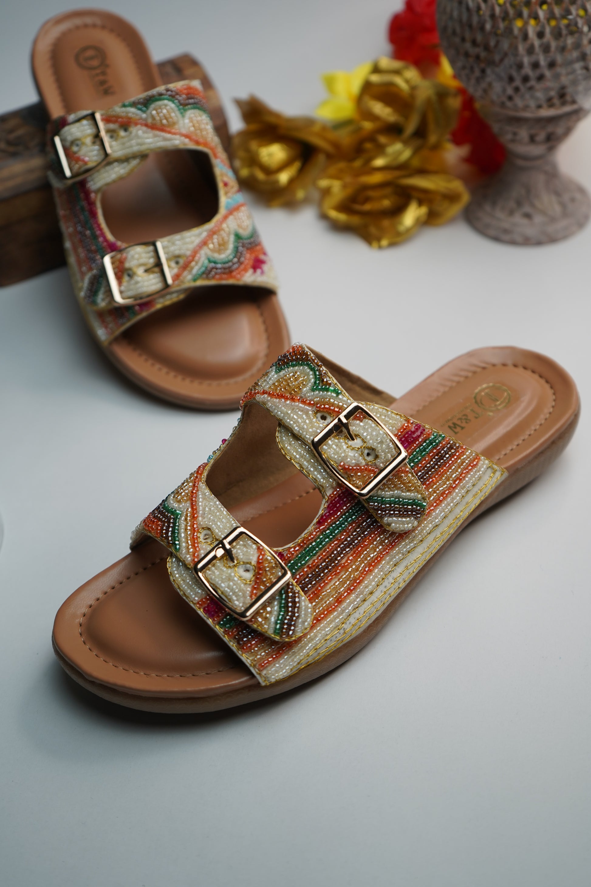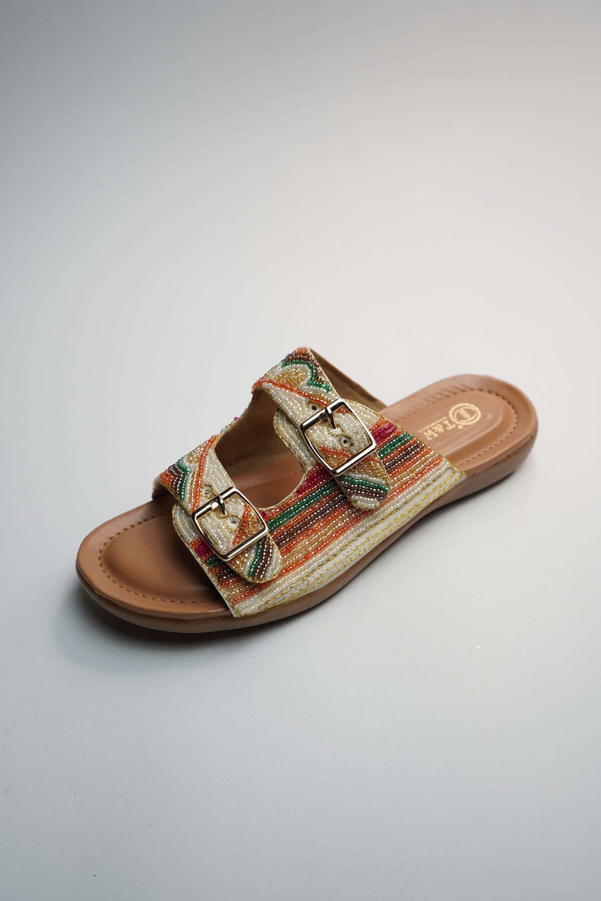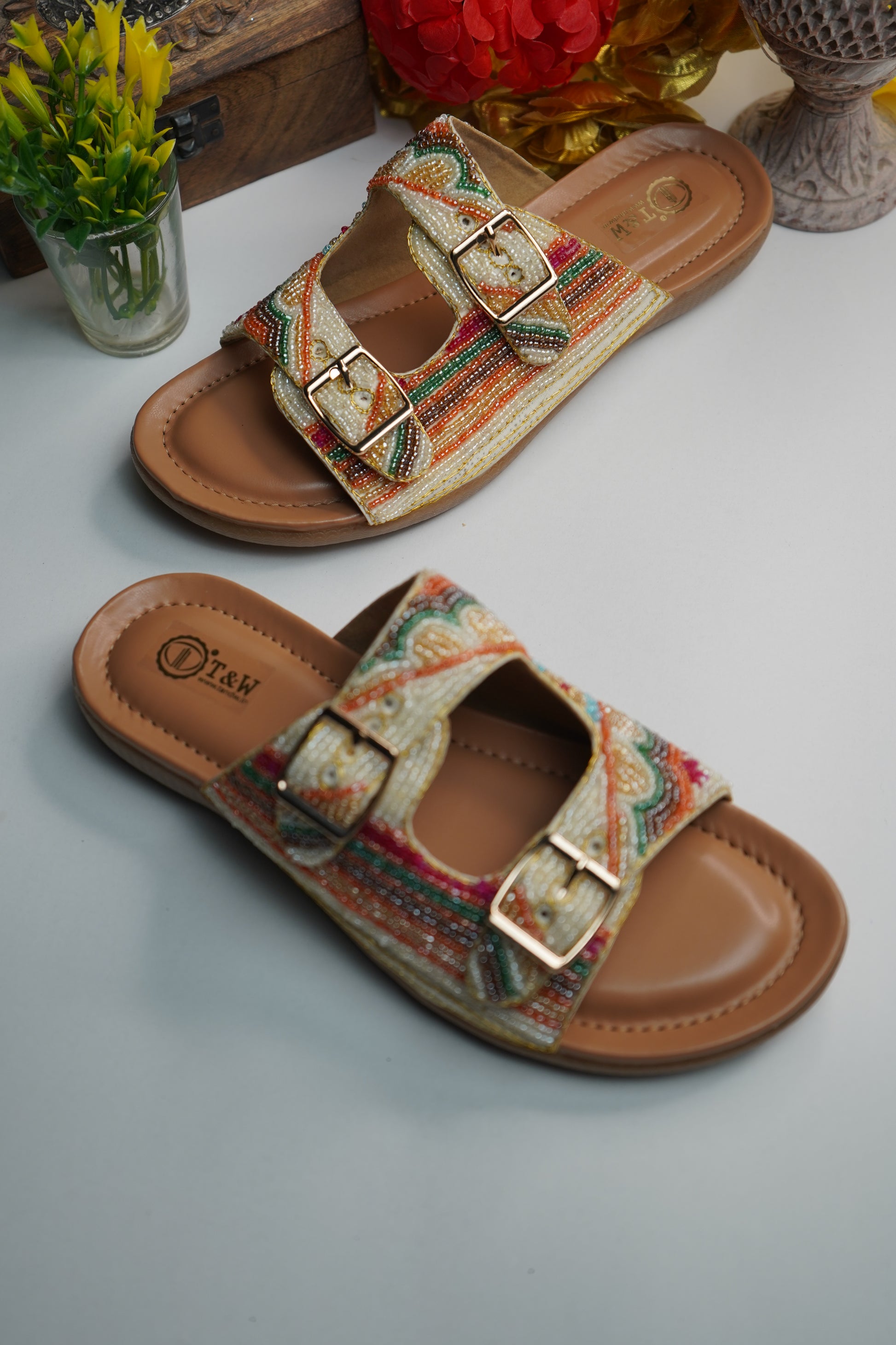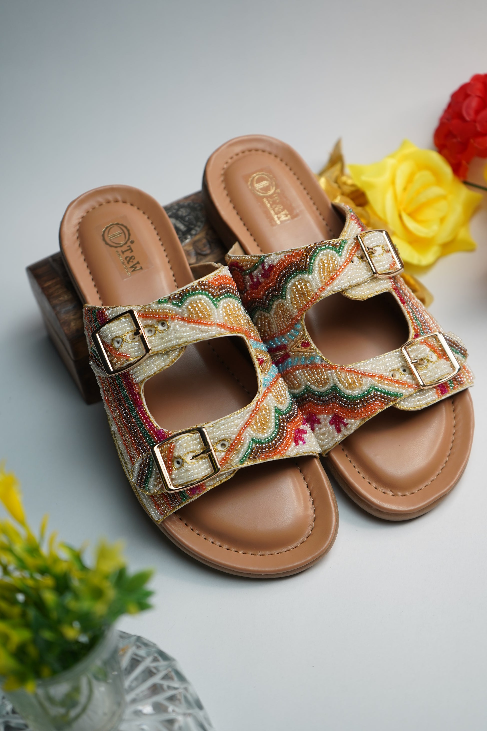 Achieve ultimate comfort and style with Tamasi Flip Flop Flate. Featuring a double belt design and inner doctor sole, these flip flops provide optimal support for your feet. The intricate Dabka work adds a touch of elegance while the product's origin in India ensures quality and authenticity. Perfect for both indoor and outdoor wear.