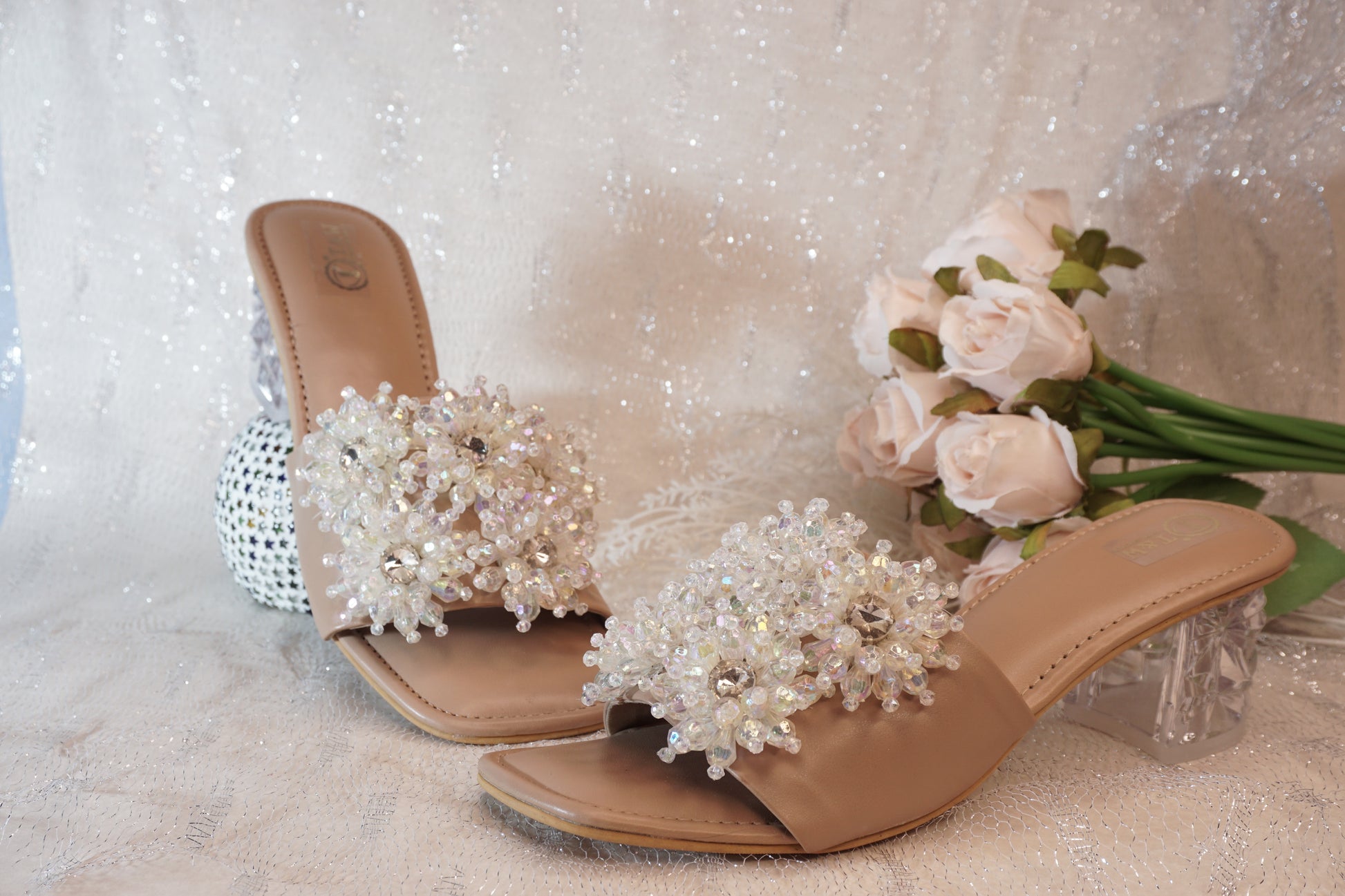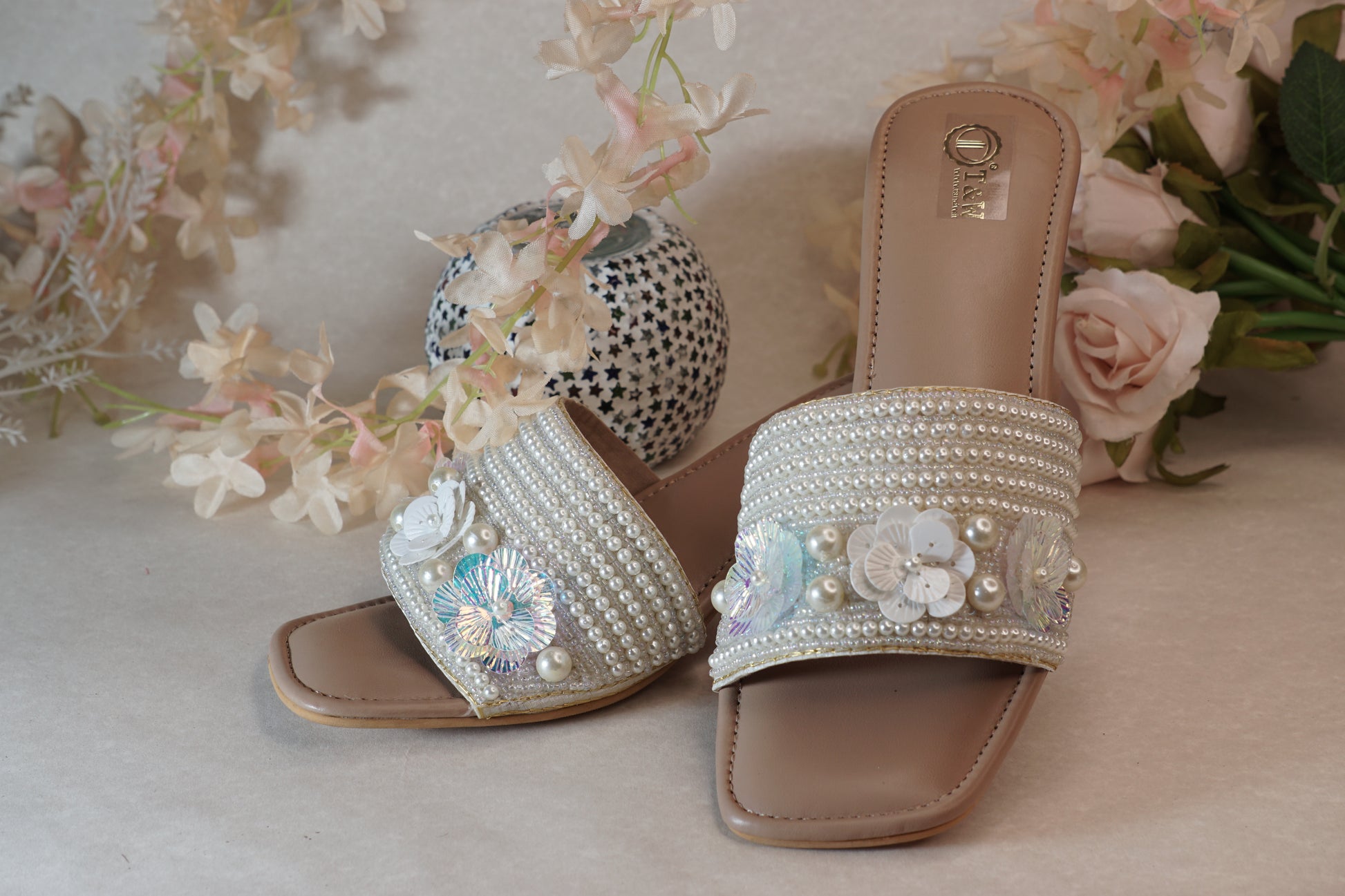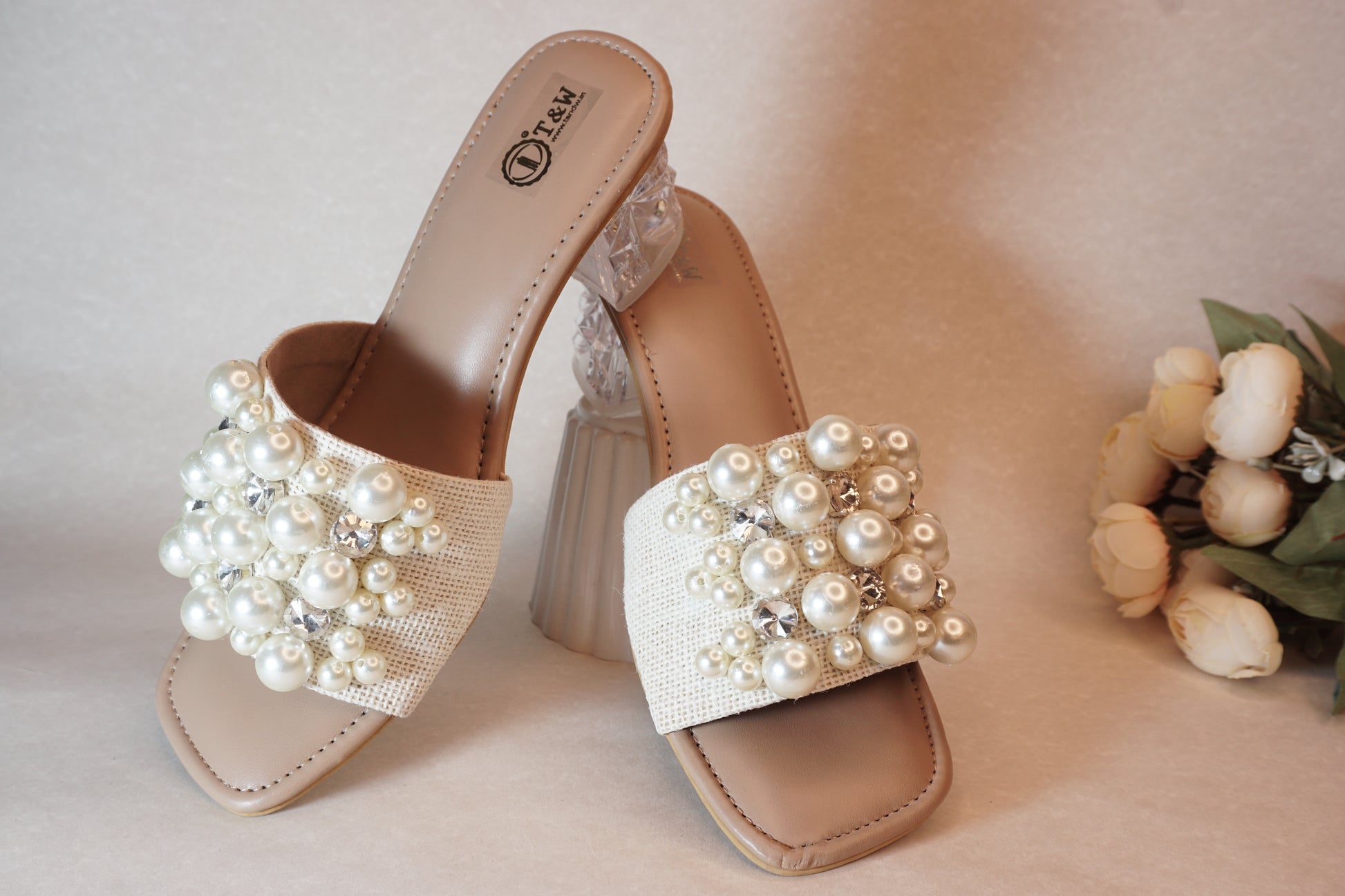 Enhance your style with our White Bulbul with Pearls. This elegant shoe features long heels, a glass transparent heel, and a stunning design with multicolored flowers and pearls. The jute material and PVC outer sole ensure durability and comfort. Make a statement with every step.